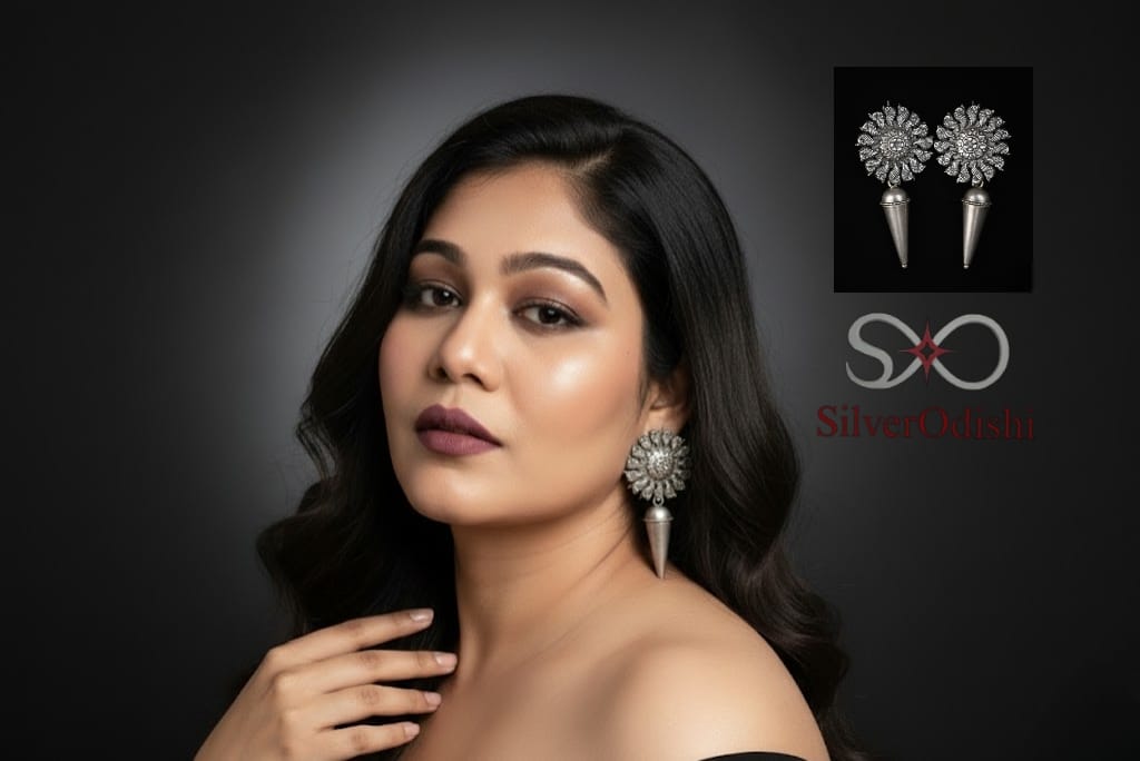 This striking pair of 92.5 oxidized silver earrings features a bold circular stud encircled by intricate fish motifs forming a radiant halo around a central floral emblem. A smooth conical drop completes the design, evoking tribal elegance and folk artistry. An exclusive heritage-inspired piece, handcrafted to make a statement of refined cultural luxury.